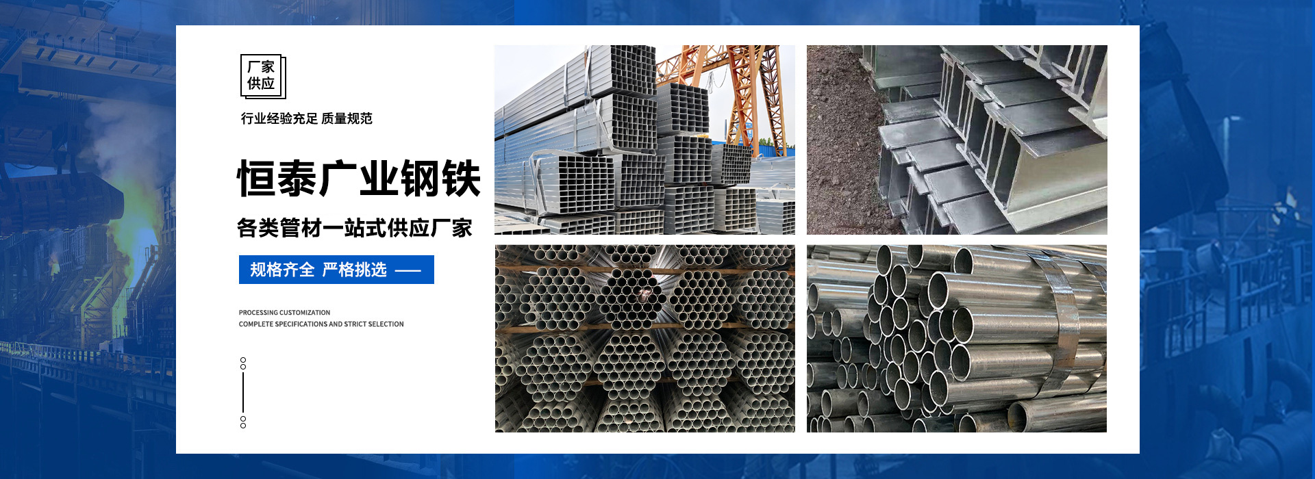 天津恒泰廣業鋼鐵有限公司是一家從事鋼鐵流通企業。本公司經過多年的努力已在華東、華北、華南地區建立起良好的信譽,不僅在同行市場營銷上取得成績,而且將直銷作為公司主要銷售模式,為直接用戶提供優惠價格、合格品質的鋼材資源,直接降低了廣大用戶的采購成本,贏的廣大鋼材采購商的信任。 天津恒泰廣業鋼鐵有限公司主營大棚管,鍍鋅管,鍍鋅方矩管,鍍鋅帶圓管,鍍鋅帶方矩管,鍍鋅H型鋼,鍍鋅角鋼,鍍鋅槽鋼,鍍鋅扁鋼,鍍鋅圓鋼等.供應溫室大棚,幕墻公司,公路設施,鋼構工程用材, 產品規格范圍: 鍍鋅鋼管4分-10寸,鍍鋅方管:20*20—800*800,選擇天津恒…